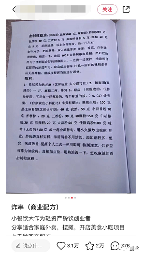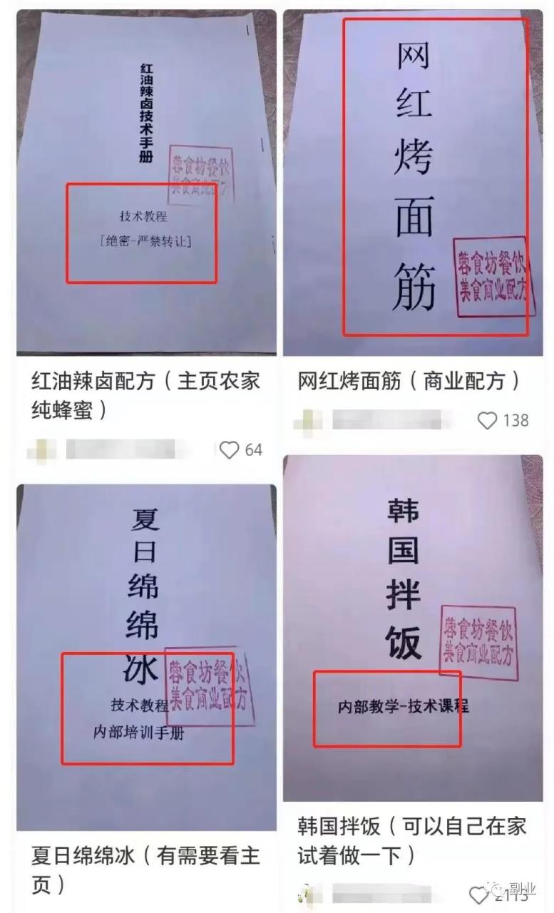 前两天我还看到某音大博主南哥的直播,就卖100个小吃配方,199块,有将近7万人购买学习,虽然不知道是不是所有人都买的这个配方,但是能量真的很大。这也是我们配方资料的来源之一,找同行啊,199买100份,卖1个人就回本。