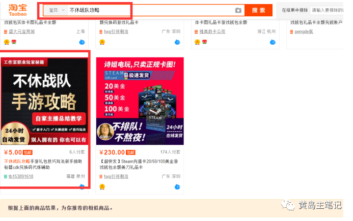 好的,我们以刚才游戏“不休战队”的为案例,去淘宝分析下,看是否可以做: