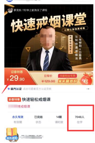 看了下销量,30元的课程七千人购买,第一条视频发布时间是11月底,截止今天已经赚了20多万。