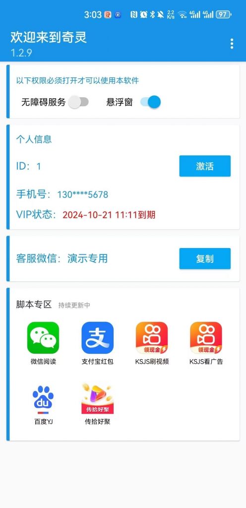 脚本卡密是20元一个月,脚本现有功能微信阅读、zfb红包、快手极速版随时在线挂机赚钱。每天10-20左右,支持安卓手机、电脑模拟器